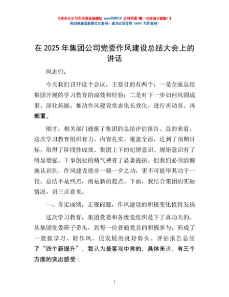 / 在2025年集团公司党委作风建设总结大会上的讲话