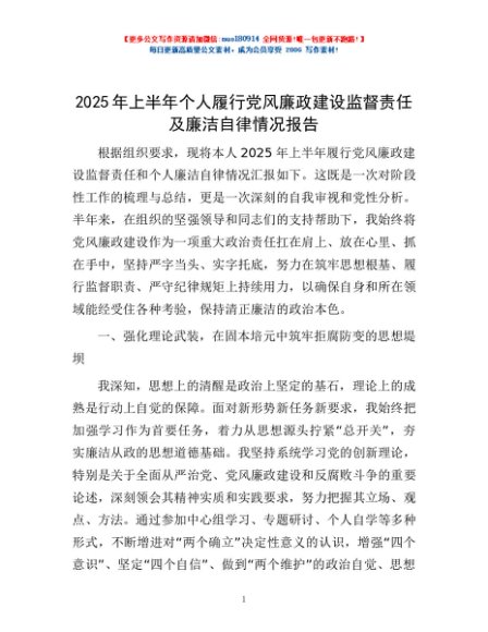 / 2025年上半年个人履行党风廉政建设监督责任及廉洁自律情况报告