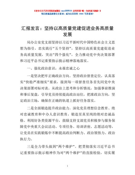 汇报发言:坚持以高质量党建促进业务高质量发展