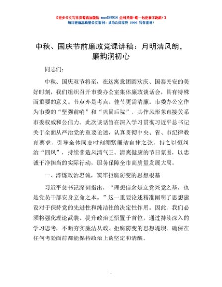 / 中秋、国庆节前廉政党课讲稿:月明清风朗,廉韵润初心