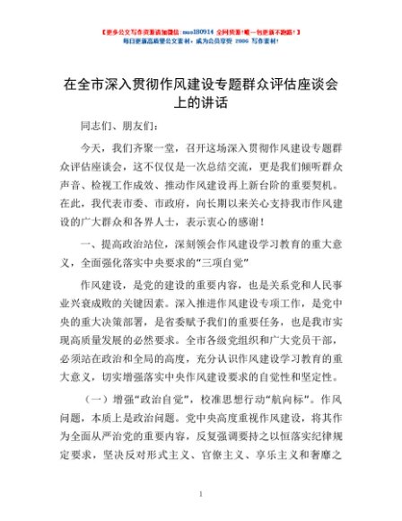 / 在全市深入贯彻作风建设专题群众评估座谈会上的讲话