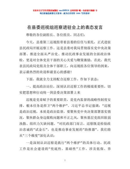 / 在县委巡视组巡察进驻会上的表态发言