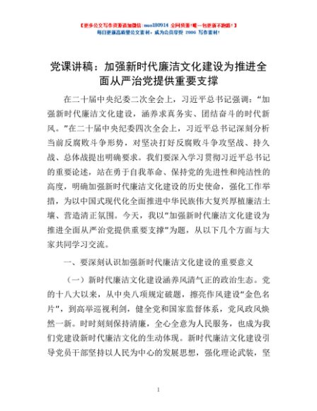 / 党课讲稿:加强新时代廉洁文化建设 为推进全面从严治党提供重要支撑