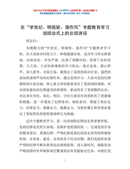 / 在“学党纪、明规矩、强作风”专题教育学习班结业式上的总结讲话