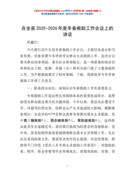 / 在全县2025-2026年度冬春救助工作会议上的讲话