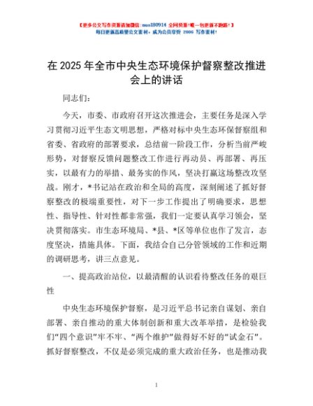 / 在2025年全市中央生态环境保护督察整改推进会上的讲话