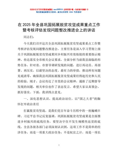/ 在2025年全县巩固拓展脱贫攻坚成果重点工作暨考核评估发现问题整改推进会上的讲话