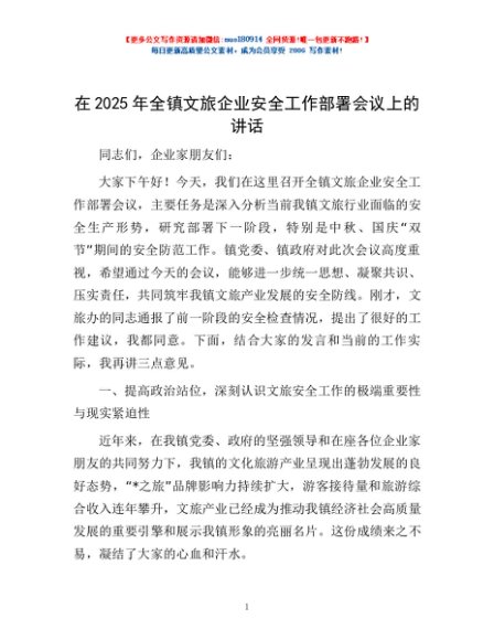 / 在2025年全镇文旅企业安全工作部署会议上的讲话