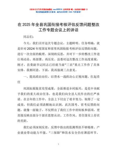 / 在2025年全县巩固衔接考核评估反馈问题整改工作专题会议上的讲话