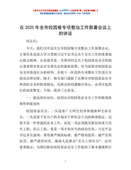 / 在2025年全市校园餐专项整治工作部署会议上的讲话