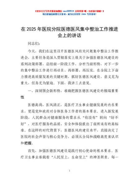 / 在2025年医院分院医德医风集中整治工作推进会上的讲话
