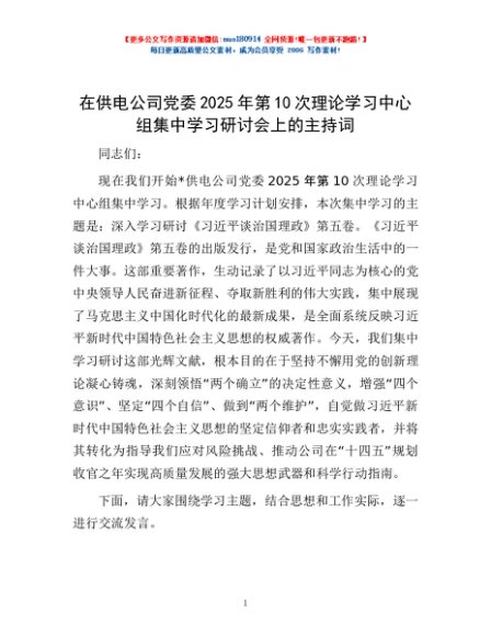 / 在供电公司党委2025年第10次理论学习中心组集中学习研讨会上的主持词