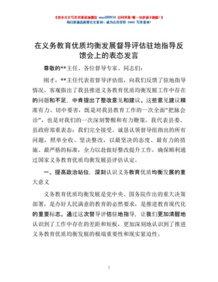 / 在义务教育优质均衡发展督导评估驻地指导反馈会上的表态发言