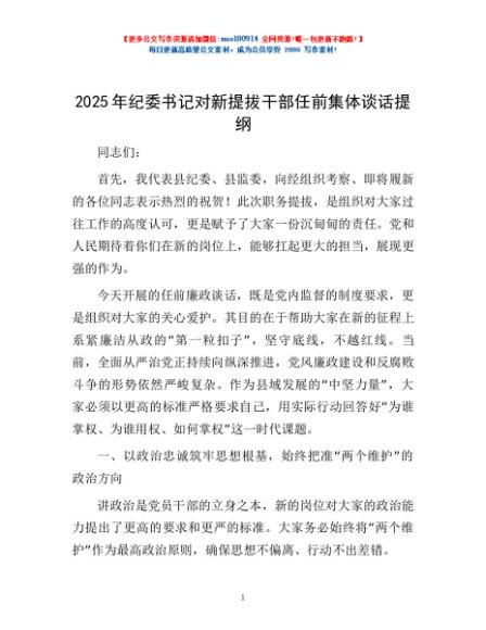 / 2025年纪委书记对新提拔干部任前集体谈话提纲