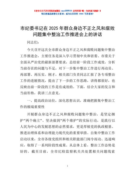 / 市纪委书记在2025年群众身边不正之风和腐败问题集中整治工作推进会上的讲话