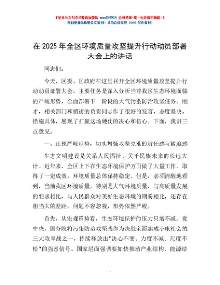 / 在2025年全区环境质量攻坚提升行动动员部署大会上的讲话