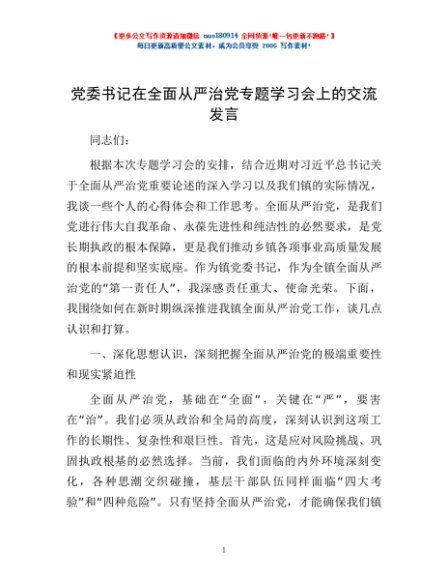 / 党委书记在全面从严治党专题学习会上的交流发言