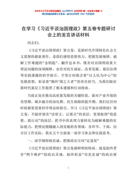 / 在学习《习近平谈治国理政》第五卷专题研讨会上的发言讲话材料