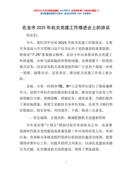 / 在全市2025年机关党建工作推进会上的讲话