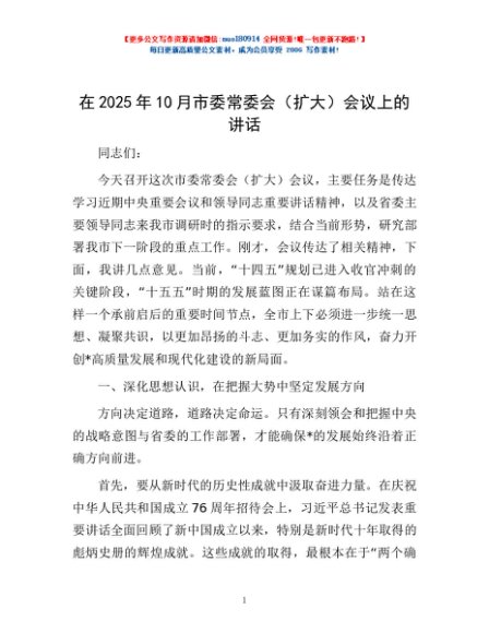 / 在2025年10月市委常委会(扩大)会议上的讲话