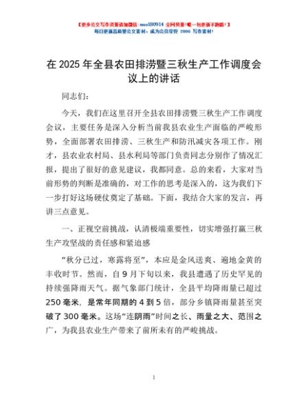 / 在2025年全县农田排涝暨三秋生产工作调度会议上的讲话