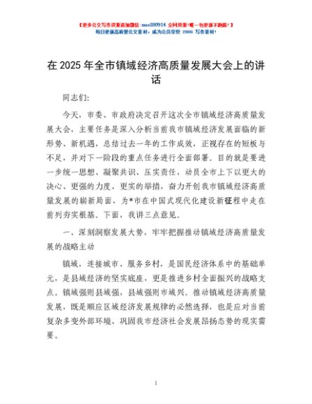 / 在2025年全市镇域经济高质量发展大会上的讲话