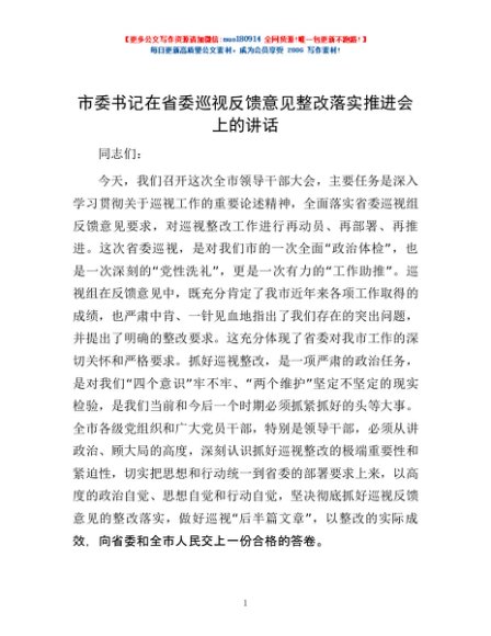 / 市委书记在省委巡视反馈意见整改落实推进会上的讲话