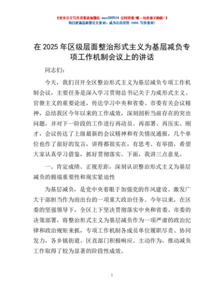 / 在2025年区级层面整治形式主义为基层减负专项工作机制会议上的讲话