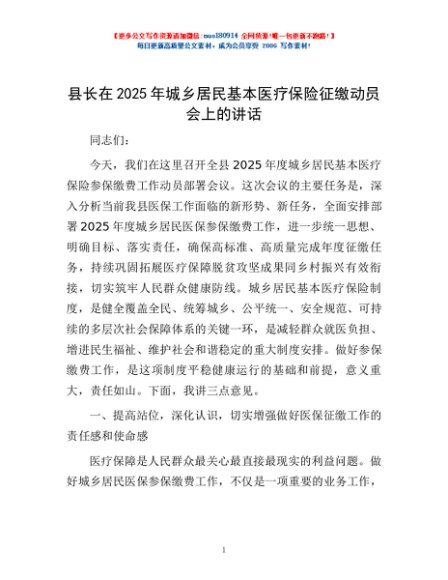 / 县长在2025年城乡居民基本医疗保险征缴动员会上的讲话