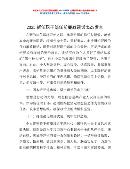 / 2025新任职干部任前廉政谈话表态发言