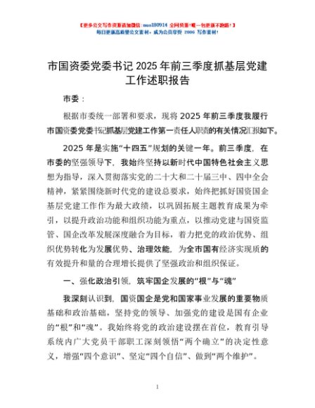 / 市国资委党委书记2025年前三季度抓基层党建工作述职报告