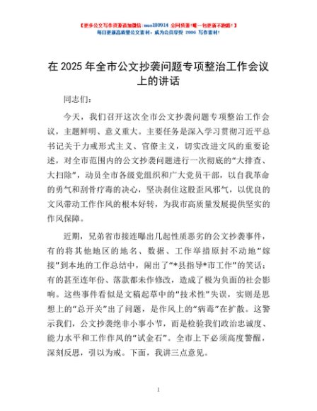 / 在2025年全市公文抄袭问题专项整治工作会议上的讲话