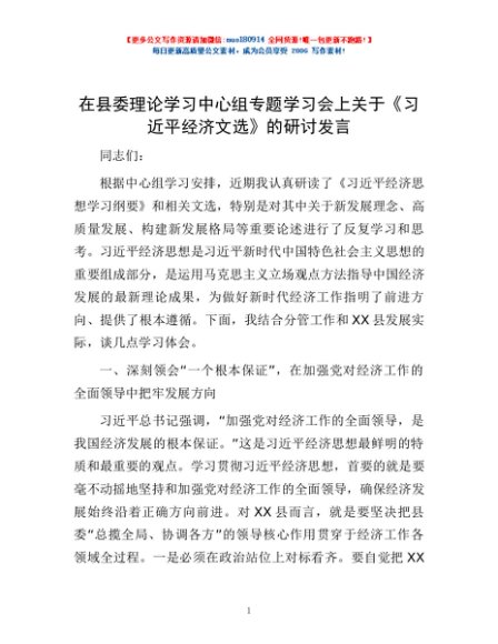 / 在县委理论学习中心组专题学习会上关于《习近平经济文选》的研讨发言