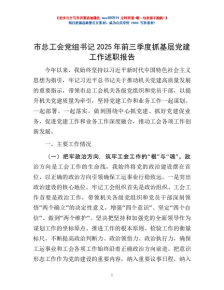 / 市总工会党组书记2025年前三季度抓基层党建工作述职报告