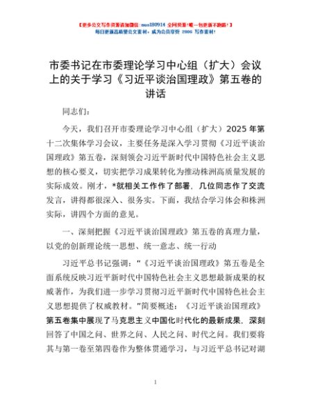 / 市委书记在市委理论学习中心组(扩大)会议上的关于学习《习近平谈治国理政》第五卷的讲话