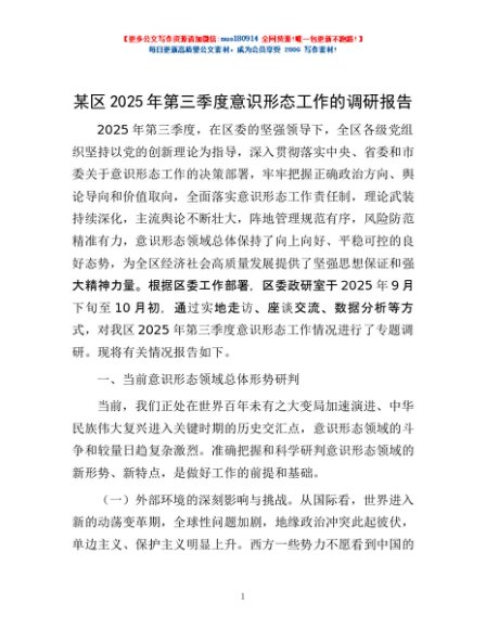某区2025年第三季度意识形态工作的调研报告