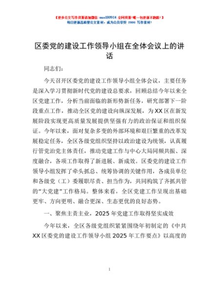 / 区委党的建设工作领导小组在全体会议上的讲话