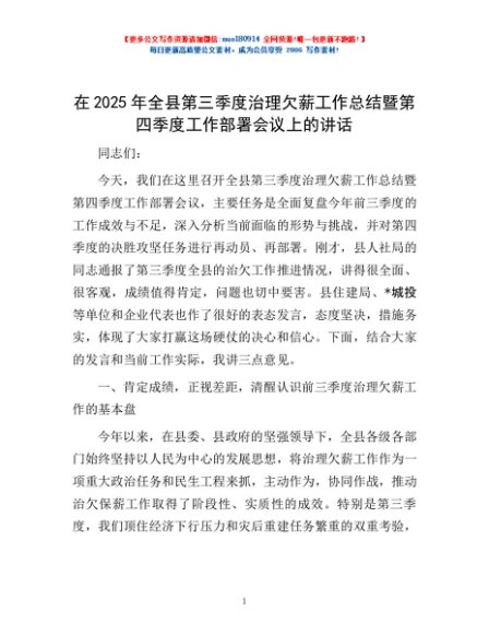 / 在2025年全县第三季度治理欠薪工作总结暨第四季度工作部署会议上的讲话