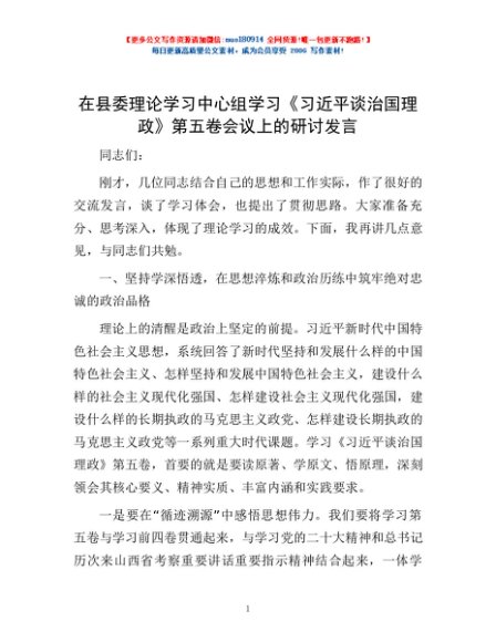 / 在县委理论学习中心组学习《习近平谈治国理政》第五卷会议上的研讨发言