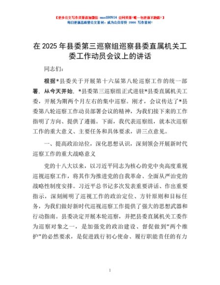 / 在2025年县委第三巡察组巡察县委直属机关工委工作动员会议上的讲话
