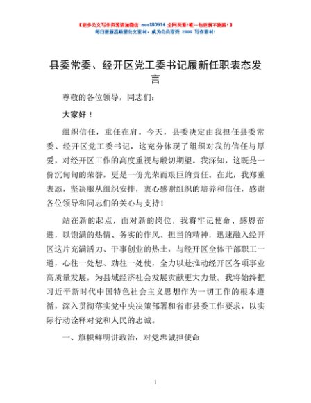 / 县委常委、经开区党工委书记履新任职表态发言