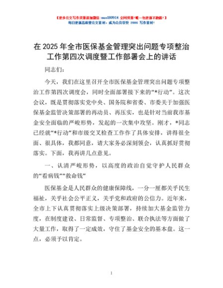 / 在2025年全市医保基金管理突出问题专项整治工作第四次调度暨工作部署会上的讲话