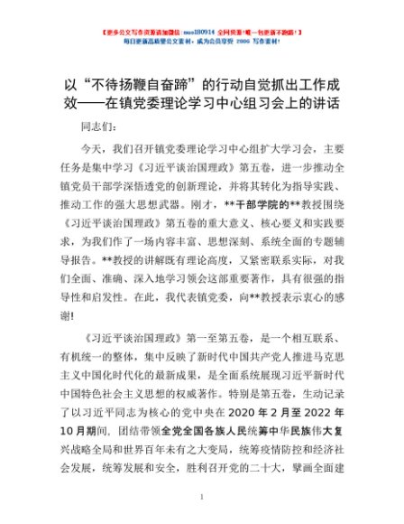 / 以“不待扬鞭自奋蹄”的行动自觉抓出工作成效——在镇党委理论学习中心组习会上的讲话