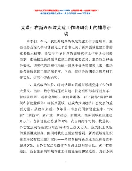 / 党课:在新兴领域党建工作培训会上的辅导讲稿