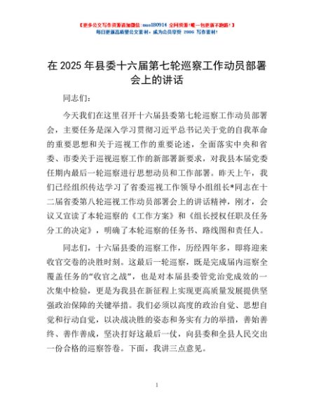/ 在2025年县委十六届第七轮巡察工作动员部署会上的讲话