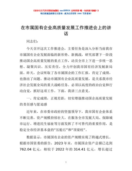 / 在市属国有企业高质量发展工作推进会上的讲话