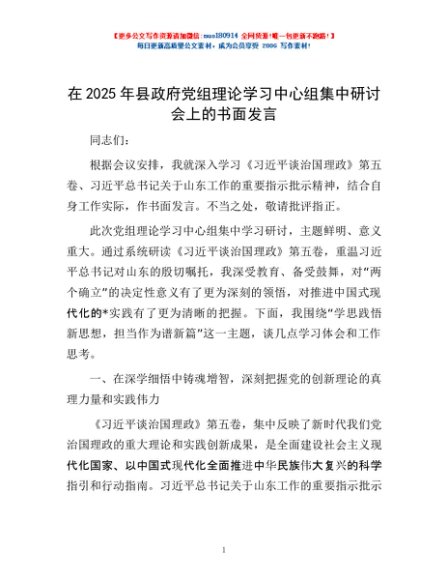/ 在2025年县政府党组理论学习中心组集中研讨会上的书面发言