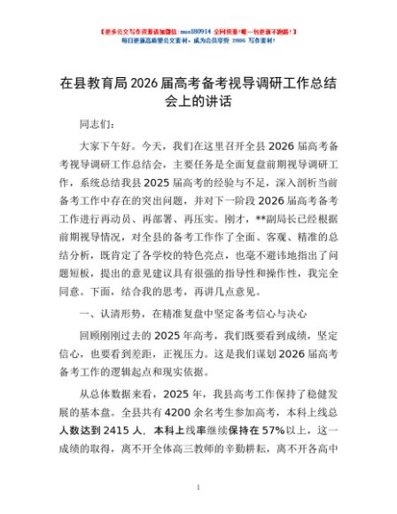 / 在县教育局2026届高考备考视导调研工作总结会上的讲话