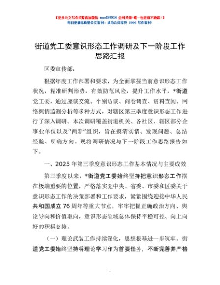 街道党工委意识形态工作调研及下一阶段工作思路汇报