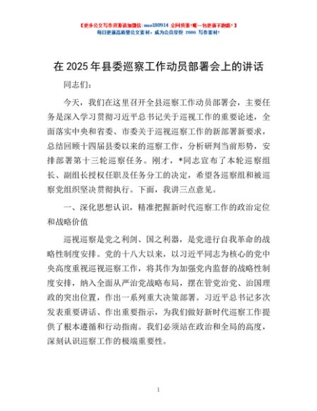 / 在2025年县委巡察工作动员部署会上的讲话
